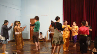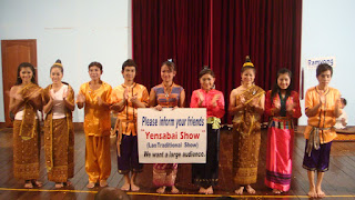While scouring the streets, i came across this sign Yensabai Show and decided to go check it out. While buying the tickets for the show (US$7), i was greeted by yet another Anehasayo!! by 2 middle age korean ladies who are waiting for the show. Through them, i came to know that this show is partly sponsored and supported by the Korean community and that explained why half of the audience are Koreans and there is even a Korean description about the show. Traditional Laos dance