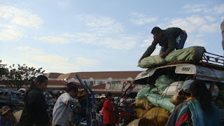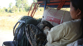 Just then, a lady came up from the back of the truck, looked me in the eye and said "Don Det?" Don Det! thats where i wanted to go! I was elated until I hear her say 30k kip... Well i managed to bargain to 20k kip=$4 and decided to go with them. Apparently the driver saw me and my backpack from afar and had stopped to pick me up! not to buy groceries from the people there. There goes my chance of hitch hiking! My pack's strap dangling at the back of the truck